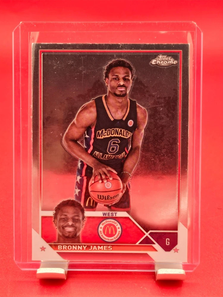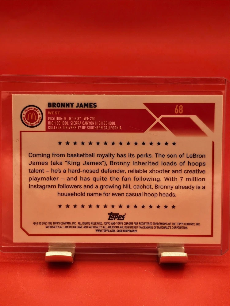 The 2023 Topps Chrome McDonald's All American trading card features Bronny James, a rookie player from the Los Angeles Lakers in the National Basketball Association (NBA). This sports trading card is part of the Chrome parallel variety and the base set for the 2023 season, making it a valuable addition to any basketball card collection. With a standard card size and no autograph, this card showcases Bronny James as he starts his career in the NBA, making it a sought-after item for fans and collectors alike.