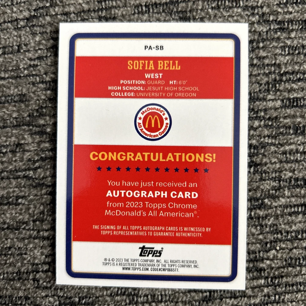 This 2023 Topps Chrome McDonald's All American trading card features Sofia Bell, a rising star in the National Basketball Association (NBA). The card is made of high-quality paper and is a short print, making it a valuable addition to any sports trading card collection. The card is designed with a parallel/variety of paper and features the Gameday name, making it a must-have for fans of the Oregon Ducks and basketball in general. This single card is a great way to show support for your favorite team and player, and it is sure to impress any collector or fan.