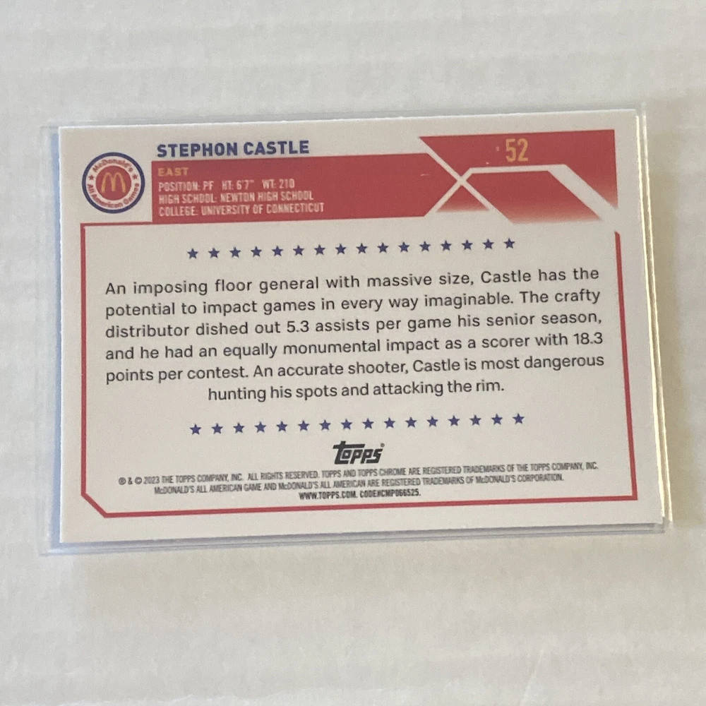 The 2023 Topps Chrome McDonald's All American trading card features Stephon Castle, a player for the UConn Huskies basketball team. This rookie card is a Refractor parallel in near mint condition or better. It is part of the base set, with card number 52, and includes the NCAA and features autograph unknown.