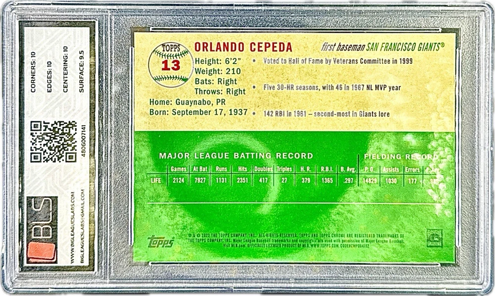 This 2023 Topps Chrome Platinum trading card features baseball legend Orlando Cepeda of the San Francisco Giants. The card is a parallel variety, with a unique Blue Mini Diamond design and only 199 cards in existence. It is also serial numbered for added authenticity. This card is a must-have for any serious collector of sports trading cards. The BLS 9.5 GEM rating ensures that this card will be a valuable addition to any collection. Don't miss your chance to own this rare and highly sought-after card.