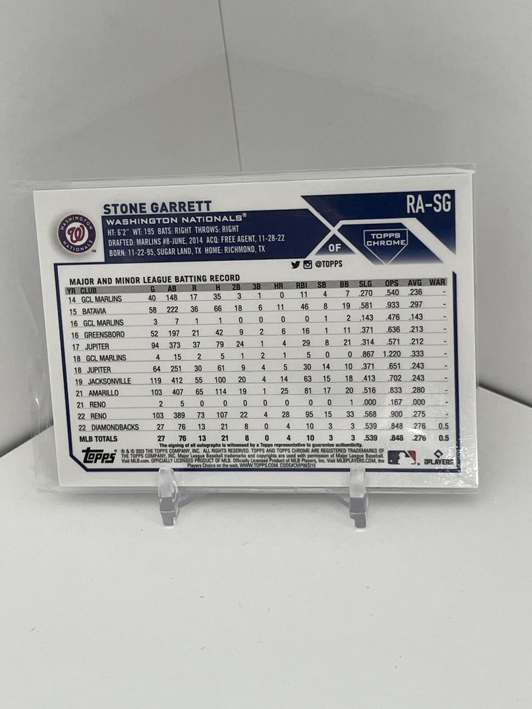 Features: Rookie, Insert, Serial Numbered, Parallel/Variety Print Run: 150 Manufacturer: Topps Set: 2023 Topps Chrome Insert Set: Rookie Autographs Type: Sports Trading Card Year Manufactured: 2023 Team: Washington Nationals Sport: Baseball Season: 2023 Player/Athlete: Stone Garrett Parallel/Variety: Blue RayWave Refractor League: Major League Baseball (MLB) Autographed: Yes Card Number: RA-SG