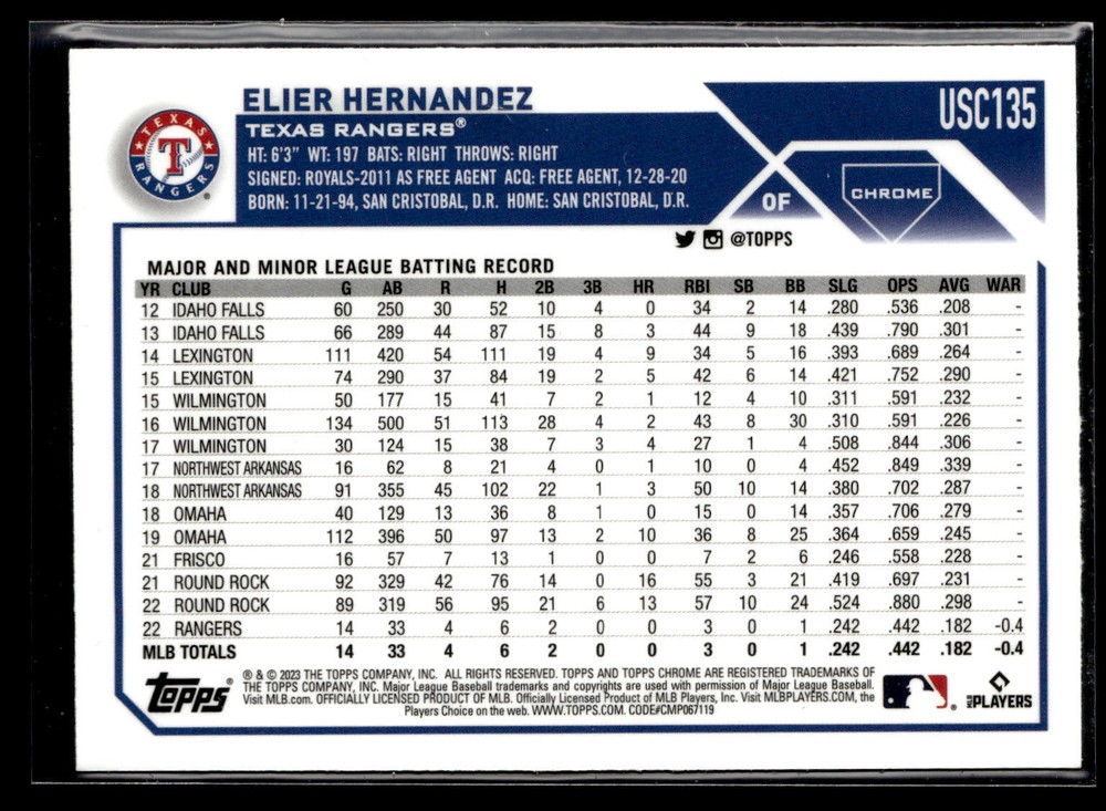 The Card pictured is the card you will receive unless there are multiple quantities then you will receive a card in the comparable grade. Cards in poor condition could have creasing, stains, rounded corners, pen marks or a combo of them. please see pics for a better understanding of cards condition. Excellent Texas Rangers RC Sepia Elier Hernandez #USC135 2023 Topps Chrome Update Topps 2023 Baseball .