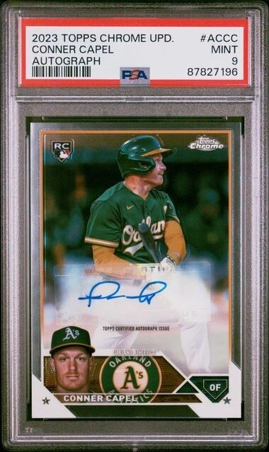 Elevate your sports memorabilia collection with the 2023 Topps Chrome Update Conner Capel Rookie Card. This coveted piece features the promising talent of Conner Capel, adorned with the official seal of the Oakland Athletics. The chrome parallel variety adds a sleek finish, making it a standout addition. Authentically autographed by Conner Capel himself, the signature is verified by Topps and showcased on a label or sticker. This card, numbered AC-CC, is a must-have for baseball enthusiasts and collectors alike, capturing the essence of the 2023 MLB season.