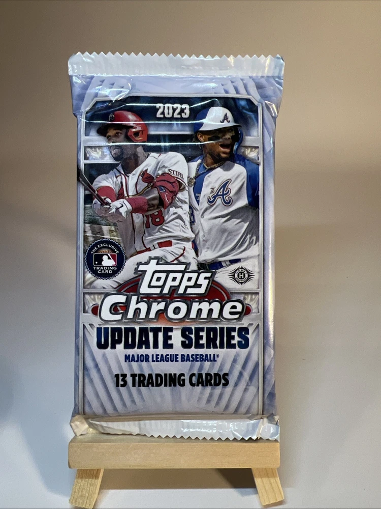 This 2023 Topps Chrome Update Series Sealed Hobby JUMBO Pack contains a variety of sports trading cards, featuring baseball players from the Major League (MLB). The cards are standard-sized and come from the Topps manufacturer. The pack is part of the 2023 TOPPS CHROME UPDATE SERIES set and is configured as a single pack. The cards in this pack are perfect for collectors who are looking for a mix of different players and teams!