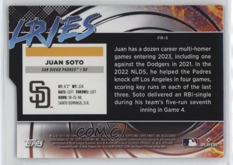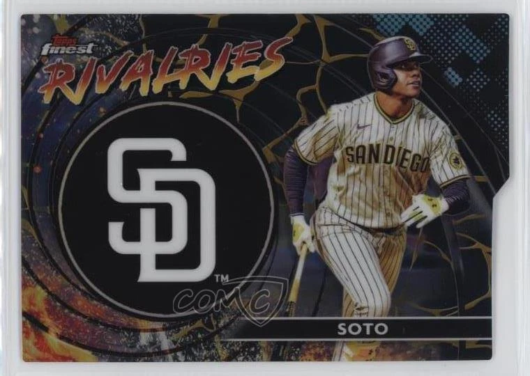 2023 Topps Finest - Finest Rivalries Die-Cuts - Kintsukuroi Black Gold #FR-3 Juan Soto - Baseball Card - Featuring the San Diego Padres - Featuring Juan Soto Search for more: 2023 Topps Finest Search for more: 2023 Topps Finest - Finest Rivalries Die-Cuts - Kintsukuroi Black Gold View all of our Listings Auctions Buy It Now About Us Located in the beautiful Pacific Northwest, COMC (Check Out My Cards) is the world's largest consignment service for trading card singles. More than 10,000 people have used our consignment service to list over 50 million trading cards. We currently house 20 million cards, each listed for sale with front and back images of the actual card. Find out how we can help you consign your items on eBay by contacting us through eBay messaging. COMC -- "The Safe & Easy Way to Buy & Sell" Representative Image - Select Specific Item above to see image of actual item Representative Image - Select Specific Item above to see image of actual item Raw Condition for Modern Cards Unless otherwise noted, raw modern cards are listed in Near Mint-Mint condition or better. A NM-MT card appears to be Mint at first glance, but upon closer inspection, may exhibit some of the following: minor print defects (e.g. roller marks, print line, dimple), minor scratches, slight edge wear, and slight corner wear. Centering is clearly visible in the images provided and does not factor into our condition assessment. Raw Condition for Vintage Cards Unless otherwise noted, raw vintage cards are listed in Excellent condition or better. An EX card may exhibit some of the following: minor rounding of corners, surface wear, print defects, light scratches, and slight edge wear/chipping. Centering is clearly visible in the images provided and does not factor into our condition assessment. Domestic Shipping Combined shipping for multiple items is available. To receive combined shipping, please ensure all desired items are in your eBay shopping cart before proceeding to checkout. eBay limits orders to 40 items per order. We automatically combine multiple orders placed on the same day. If you place multiple orders on the same day, please contact us to request a refund of applicable shipping costs. Signature confirmation may be required on invoices over $400. Raw cards are shipped in toploaders. International Shipping COMC offers eBay's International Shipping (EIS) for international orders under $2,500* (see country exceptions below). All duties and import fees are paid at checkout; in the rare event that there are additional import fees upon delivery, these are borne by the buyer. EIS packages route through a shipping hub in Erlanger, KY before shipping to their final destination. Please note that EIS does not allow for combined shipments. The shipping rates are determined by eBay and cannot be adjusted. *Maximum sale price exceptions: Colombia, Kuwait ($2,000); Taiwan ($1,539); Chile, Costa Rica, Guatemala, Honduras, Trinidad and Tobago ($1,000); Antigua and Barbuda, Aruba, Belize, Dominica, Grenada, Philippines, Saint Kitts and Nevis, Saint Lucia, Montserrat, Turks and Caicos Islands ($500); Dominican Republic, El Salvador ($200). Please request a shipping quote through eBay messaging for orders that exceed the maximum sale price supported by eBay's International Shipping. You will be responsible for all duties and import fees for international orders shipped outside the EIS. Raw cards are shipped in toploaders. Payment COMC does not accept offers on our cards through our eBay storefront. COMC utilizes eBay’s managed payments system. If you are experiencing difficulties making a payment, please contact eBay for assistance. Return Policy Returns are only accepted on the rare occasion the item is not as described. If you are making a return, please initiate the return process through eBay so a mailing label can be provided for you. Prior to listing, our expert team carefully assessed this item to represent it accurately. Please review the description and high-definition images prior to purchasing to ensure this item meets your satisfaction. We welcome you to contact us if you have further questions about this item. Trust and Integrity COMC carefully assesses each item consigned to us to prevent fraudulent items from entering the marketplace. If you believe an item offered on COMC may be fraudulent, please contact us with details so we can investigate the issue. Items we determine are outside our supported items policy may be removed. Last Modified: 12/9/2024 10:08:04 AM PDT