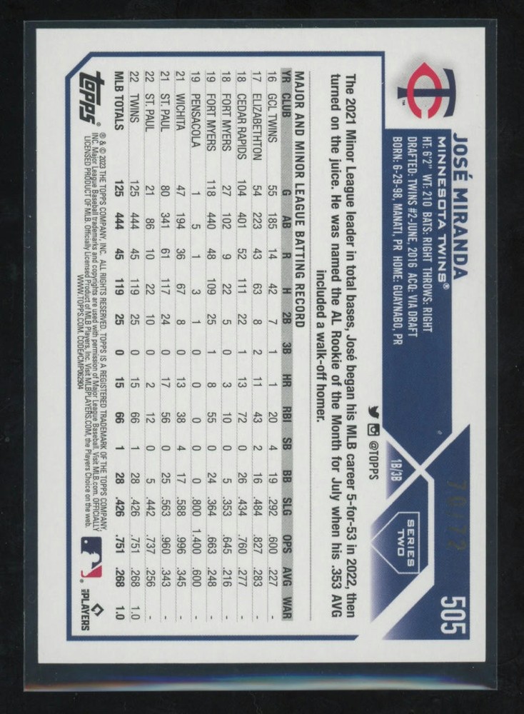 This is a nice example of a 2023 Topps #505 José Miranda Black Other important information about this card: SN In 2023 José Miranda played for the Minnesota Twins. Please check out our other listings for more great cards.