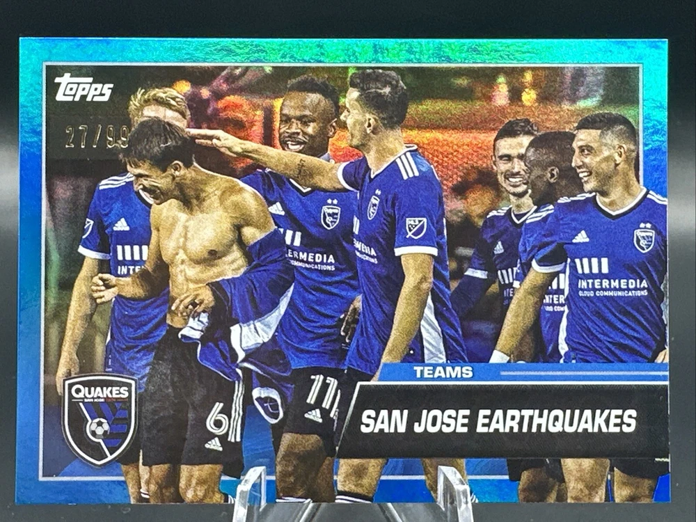 This 2023 Topps MLS Team Card Blue Foil is a must-have for any soccer fan and collector. It features the San Jose Earthquakes team and is an original card with a print run of 27/99. The card is made of high-quality card stock and has a parallel variety with a blue foil design. The card is part of the 2023 Topps MLS set and is an insert with a serial number. It is also an original card and not a licensed reprint. The card features the Earthquakes team logo and name, and is in English language. This card is perfect for any fan of the Major League Soccer and collectors of sports trading cards.