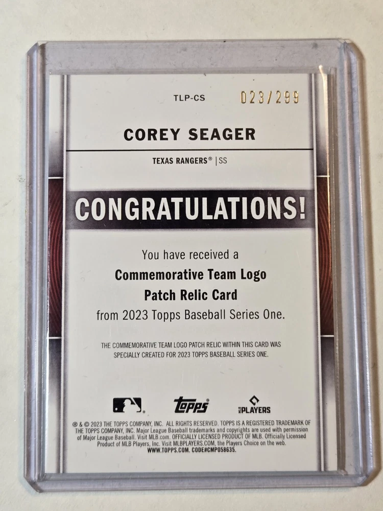 2023 Topps Team Logo Patch TLP-CS Corey Seager 023/299 Black Texas Rangers π₯ π₯ Thanks for looking and be sure to check out my other listings. I do combine shipping, you can either wait for an invoice after all of your auctions end, or pay and I will issue a refund for the difference in shipping. Enjoy!