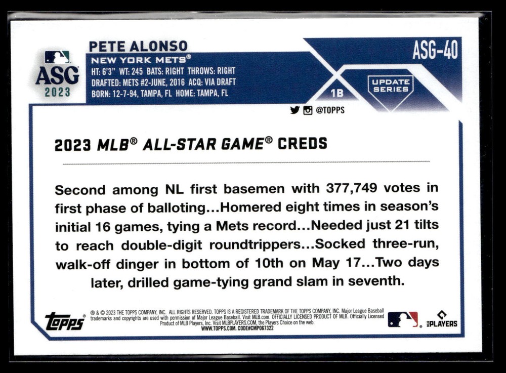 The Card pictured is the card you will receive unless there are multiple quantities then you will receive a card in the comparable grade. Cards in poor condition could have creasing, stains, rounded corners, pen marks or a combo of them. please see pics for a better understanding of cards condition. Excellent New York Mets 2023 All-Star Game Pete Alonso #ASG-40 2023 Topps Update Topps 2023 Baseball .