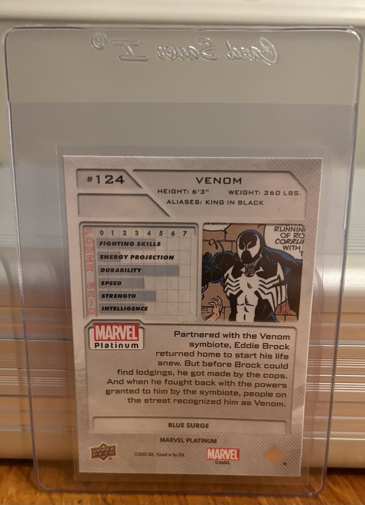This Venom card is absolutely stunning! The Blue Surge Parallel makes the artwork pop, and the condition looks pristine. Fast shipping and secure packaging—highly recommend for any Marvel collector!