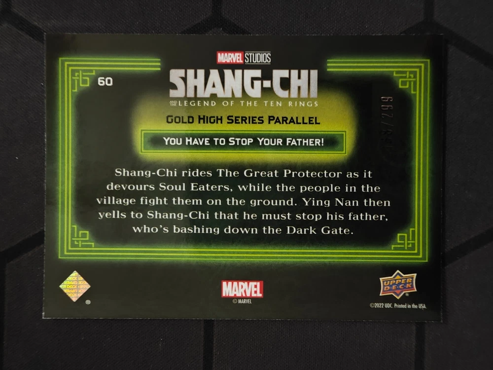 Type: Non-Sport Trading Card Manufacturer: Upper Deck Card Size: Standard Set: 2023 Upper Deck Marvel Shang-Chi Year Manufactured: 2023 Language: English Parallel/Variety: Gold Franchise: Marvel (MCU)