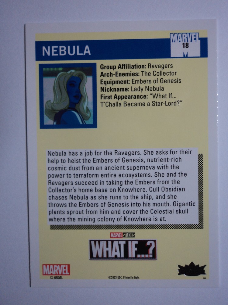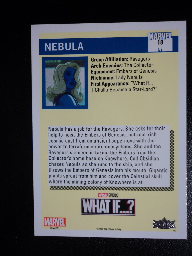 PLEASE DO NOT PAY FOR MULTIPLE PURCHASES SEPARATELY ______________________________________________________________________________________________ Here's what you get: Marvel What If ? - Upper Deck - 2023 CHASE CARD 1990 MARVEL UNIVERSE # 18 NEBULA ______________________________________________________________________________________________ Card stored in a smoke-free home. Payment due within 48 hours of purchase. NOTE: IF PURCHASING FROM MORE THEN ONE LISTING, PLEASE DO NOT PAY FOR THEM SEPARATELY, RATHER REQUEST AN INVOICE FROM ME, OR AWAIT RECEIPT OF AN INVOICE FROM ME BEFORE PAYING. When possible, I will combine shipping and handling. A tracking number will be provided on all First Class and Priority packages. You must have a confirmed eBay mailing address. My goal is to provide excellent service to buyers, so I may earn your business over and over. Any questions, please feel free to e-mail me. Please check out my other listings. Happy Collecting. ______________________________________________________________________________________________