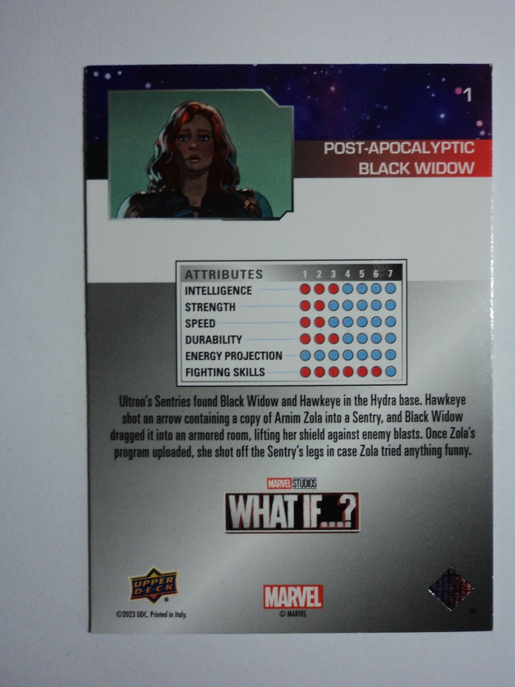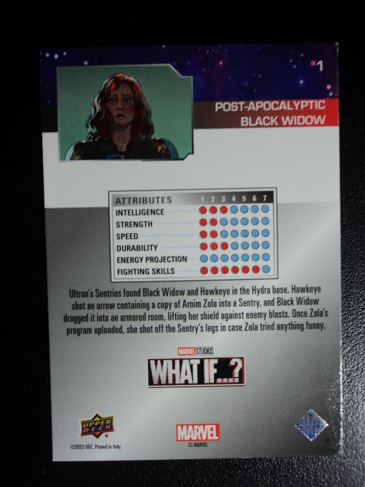 PLEASE DO NOT PAY FOR MULTIPLE PURCHASES SEPARATELY ______________________________________________________________________________________________ Here's what you get: Marvel What If ? - Upper Deck - 2023 BASE CARD # 1 POST-APOCALYPTIC BLACK WIDOW ______________________________________________________________________________________________ Card stored in a smoke-free home. Payment due within 48 hours of purchase. NOTE: IF PURCHASING FROM MORE THEN ONE LISTING, PLEASE DO NOT PAY FOR THEM SEPARATELY, RATHER REQUEST AN INVOICE FROM ME, OR AWAIT RECEIPT OF AN INVOICE FROM ME BEFORE PAYING. When possible, I will combine shipping and handling. A tracking number will be provided on all First Class and Priority packages. You must have a confirmed eBay mailing address. My goal is to provide excellent service to buyers, so I may earn your business over and over. Any questions, please feel free to e-mail me. Please check out my other listings. Happy Collecting. ______________________________________________________________________________________________