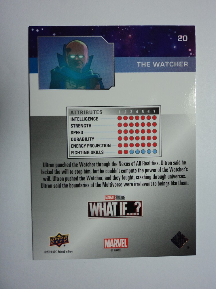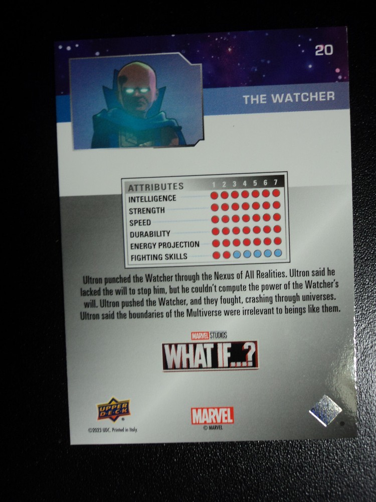 PLEASE DO NOT PAY FOR MULTIPLE PURCHASES SEPARATELY ______________________________________________________________________________________________ Here's what you get: Marvel What If ? - Upper Deck - 2023 BASE CARD # 20 THE WATCHER ______________________________________________________________________________________________ Card stored in a smoke-free home. Payment due within 48 hours of purchase. NOTE: IF PURCHASING FROM MORE THEN ONE LISTING, PLEASE DO NOT PAY FOR THEM SEPARATELY, RATHER REQUEST AN INVOICE FROM ME, OR AWAIT RECEIPT OF AN INVOICE FROM ME BEFORE PAYING. When possible, I will combine shipping and handling. A tracking number will be provided on all First Class and Priority packages. You must have a confirmed eBay mailing address. My goal is to provide excellent service to buyers, so I may earn your business over and over. Any questions, please feel free to e-mail me. Please check out my other listings. Happy Collecting. ______________________________________________________________________________________________