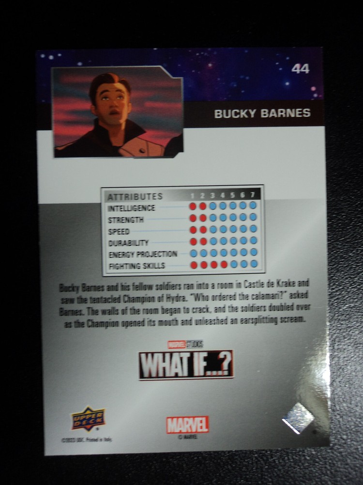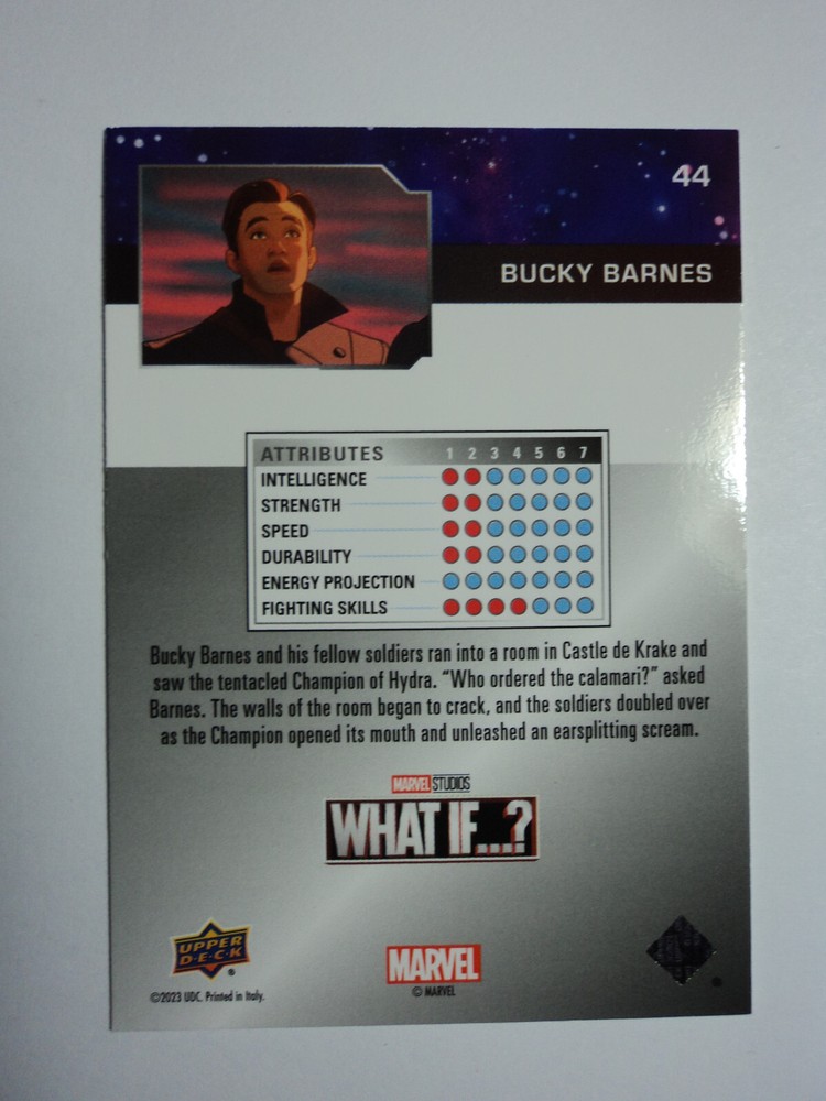 PLEASE DO NOT PAY FOR MULTIPLE PURCHASES SEPARATELY ______________________________________________________________________________________________ Here's what you get: Marvel What If ? - Upper Deck - 2023 BASE CARD # 44 BUCKY BARNES ______________________________________________________________________________________________ Card stored in a smoke-free home. Payment due within 48 hours of purchase. NOTE: IF PURCHASING FROM MORE THEN ONE LISTING, PLEASE DO NOT PAY FOR THEM SEPARATELY, RATHER REQUEST AN INVOICE FROM ME, OR AWAIT RECEIPT OF AN INVOICE FROM ME BEFORE PAYING. When possible, I will combine shipping and handling. A tracking number will be provided on all First Class and Priority packages. You must have a confirmed eBay mailing address. My goal is to provide excellent service to buyers, so I may earn your business over and over. Any questions, please feel free to e-mail me. Please check out my other listings. Happy Collecting. ______________________________________________________________________________________________