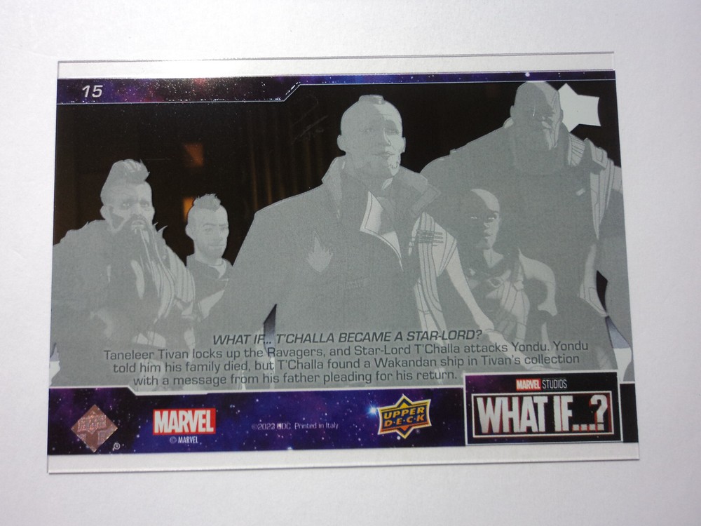PLEASE DO NOT PAY FOR MULTIPLE PURCHASES SEPARATELY ______________________________________________________________________________________________ Here's what you get: Marvel What If ? - Upper Deck - 2023 CHASE CARD CLEAR CUT CHAPTERS - EPISODE 2 # 15 WHAT IF...T'CHALLA BECAME A STAR-LORD? ______________________________________________________________________________________________ Card stored in a smoke-free home. Payment due within 48 hours of purchase. NOTE: IF PURCHASING FROM MORE THEN ONE LISTING, PLEASE DO NOT PAY FOR THEM SEPARATELY, RATHER REQUEST AN INVOICE FROM ME, OR AWAIT RECEIPT OF AN INVOICE FROM ME BEFORE PAYING. When possible, I will combine shipping and handling. A tracking number will be provided on all First Class and Priority packages. You must have a confirmed eBay mailing address. My goal is to provide excellent service to buyers, so I may earn your business over and over. Any questions, please feel free to e-mail me. Please check out my other listings. Happy Collecting. ______________________________________________________________________________________________