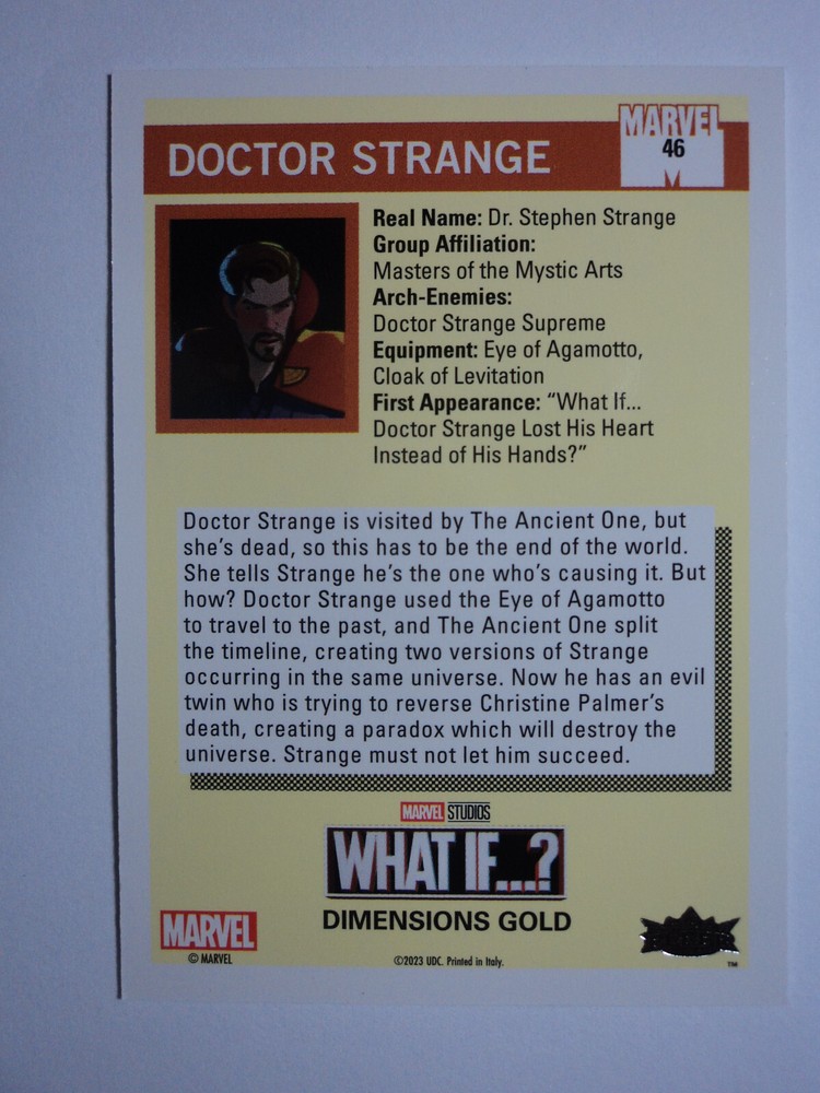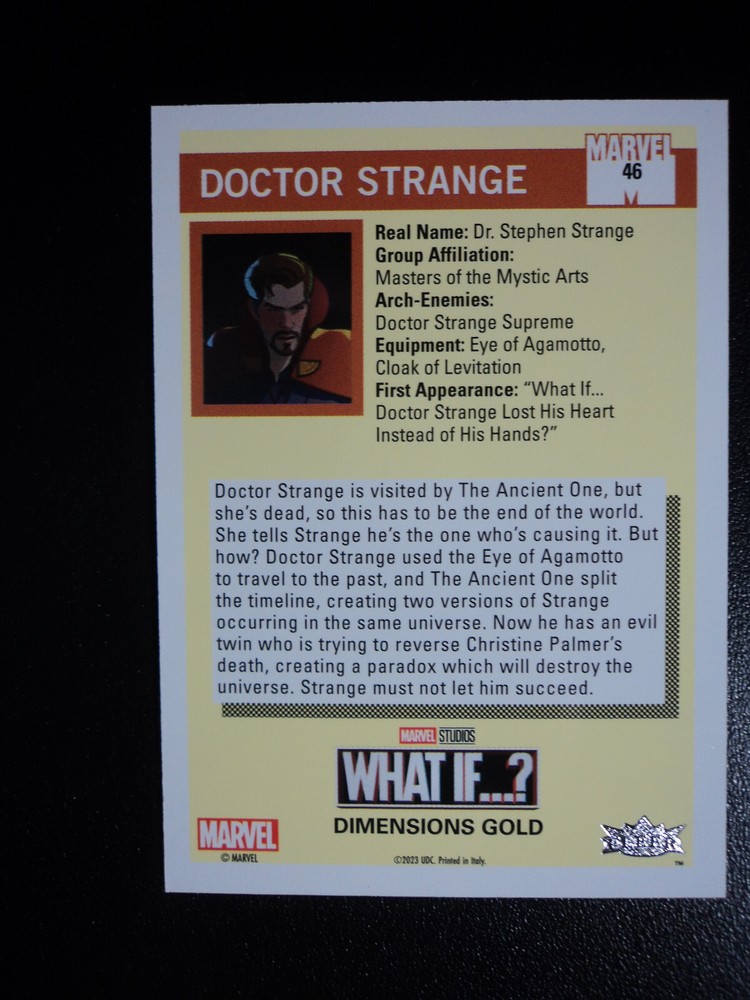 PLEASE DO NOT PAY FOR MULTIPLE PURCHASES SEPARATELY ______________________________________________________________________________________________ Here's what you get: Marvel What If ? - Upper Deck - 2023 CHASE CARD DIMENSIONS GOLD CARD # 46 (243/688) DOCTOR STRANGE ______________________________________________________________________________________________ Card stored in a smoke-free home. Payment due within 48 hours of purchase. NOTE: IF PURCHASING FROM MORE THEN ONE LISTING, PLEASE DO NOT PAY FOR THEM SEPARATELY, RATHER REQUEST AN INVOICE FROM ME, OR AWAIT RECEIPT OF AN INVOICE FROM ME BEFORE PAYING. When possible, I will combine shipping and handling. A tracking number will be provided on all First Class and Priority packages. You must have a confirmed eBay mailing address. My goal is to provide excellent service to buyers, so I may earn your business over and over. Any questions, please feel free to e-mail me. Please check out my other listings. Happy Collecting. ______________________________________________________________________________________________