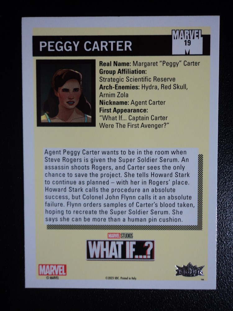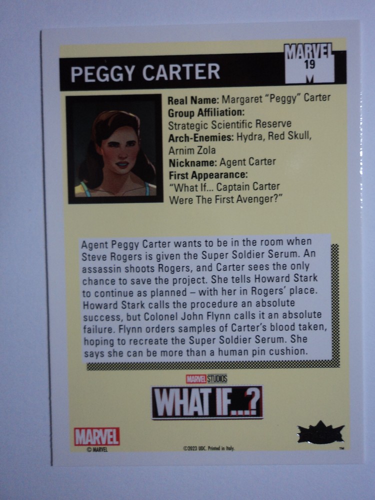 PLEASE DO NOT PAY FOR MULTIPLE PURCHASES SEPARATELY ______________________________________________________________________________________________ Here's what you get: Marvel What If ? - Upper Deck - 2023 CHASE CARD 1990 MARVEL UNIVERSE # 19 PEGGY CARTER ______________________________________________________________________________________________ Card stored in a smoke-free home. Payment due within 48 hours of purchase. NOTE: IF PURCHASING FROM MORE THEN ONE LISTING, PLEASE DO NOT PAY FOR THEM SEPARATELY, RATHER REQUEST AN INVOICE FROM ME, OR AWAIT RECEIPT OF AN INVOICE FROM ME BEFORE PAYING. When possible, I will combine shipping and handling. A tracking number will be provided on all First Class and Priority packages. You must have a confirmed eBay mailing address. My goal is to provide excellent service to buyers, so I may earn your business over and over. Any questions, please feel free to e-mail me. Please check out my other listings. Happy Collecting. ______________________________________________________________________________________________