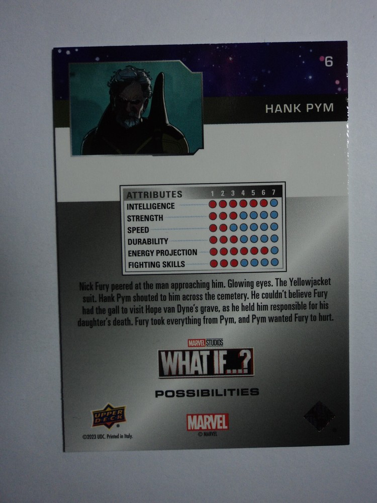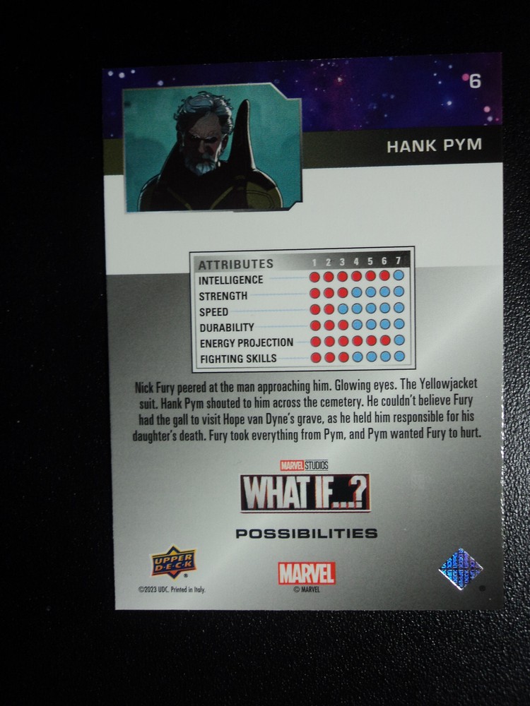 PLEASE DO NOT PAY FOR MULTIPLE PURCHASES SEPARATELY ______________________________________________________________________________________________ Here's what you get: Marvel What If ? - Upper Deck - 2023 CHASE CARD POSSIBILITIES HANK PYM # 6 ______________________________________________________________________________________________ Card stored in a smoke-free home. Payment due within 48 hours of purchase. NOTE: IF PURCHASING FROM MORE THEN ONE LISTING, PLEASE DO NOT PAY FOR THEM SEPARATELY, RATHER REQUEST AN INVOICE FROM ME, OR AWAIT RECEIPT OF AN INVOICE FROM ME BEFORE PAYING. When possible, I will combine shipping and handling. A tracking number will be provided on all First Class and Priority packages. You must have a confirmed eBay mailing address. My goal is to provide excellent service to buyers, so I may earn your business over and over. Any questions, please feel free to e-mail me. Please check out my other listings. Happy Collecting. ______________________________________________________________________________________________