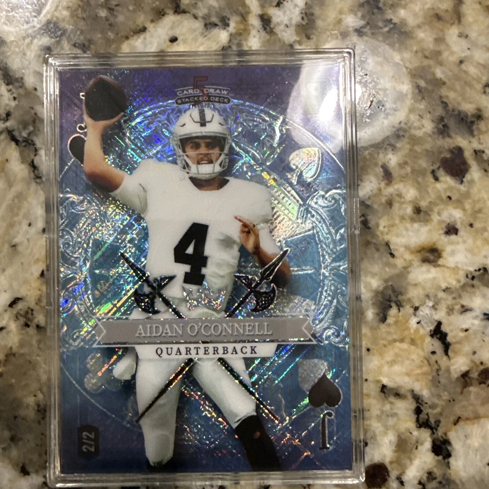 The 2023 Wild Card 5 Card Draw Stacked Deck features a rare card of Aidan O'Connell, representing the Jack of Hearts in a limited print run of only 2 cards. This sports trading card is part of a set by Wild Card for the 2023 season, showcasing O'Connell as a rookie player for both the Las Vegas Raiders and Purdue Boilermakers. The card is in near mint or better condition and includes features like being serial numbered and a parallel/variety card.