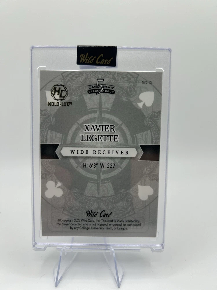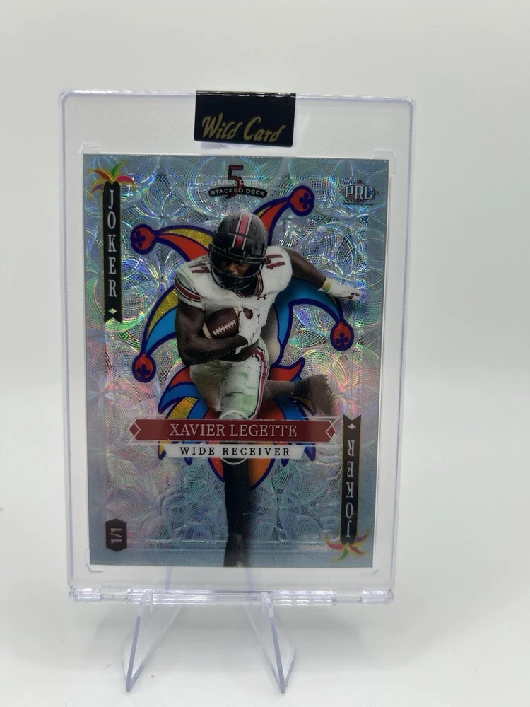 This 2023 Wild Card 5 Card Draw features Xavier Legette, a player from the Carolina Panthers team in the National Football League (NFL). The card is an original and comes from a print run of 1/1, making it a rare find for collectors. The card is ungraded but is in near mint or better condition. The card is a sports trading card and is part of the 2023 Wild Card set. It features a white joker parallel/variety and is one of one, making it a unique addition to any collection. The card was manufactured in the United States by Wild Card and is an authentic, licensed product.