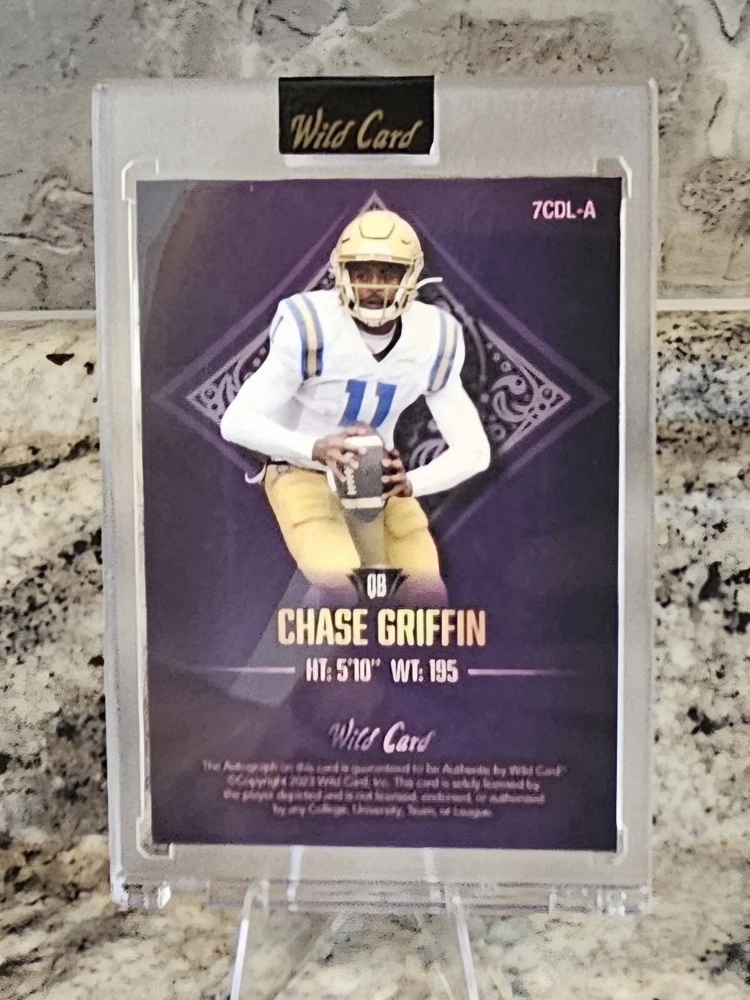 Elevate your collection with the 2023 Wild Card 7 Card Studs #7CSR-14 featuring the talented Chase Griffin. This sought-after card is a must-have for UCLA Bruins enthusiasts and football collectors alike. With a limited print run of just 1/6, it's a rare find that celebrates Griffin's rookie season in style. The card is autographed by Griffin himself, adding a personal touch to this collectible. Crafted in the United States and part of the renowned Wild Card set, it's a treasure for those who appreciate the craftsmanship of a well-made card and the excitement of NCAA football. Don't miss the chance to own this piece of sports history.