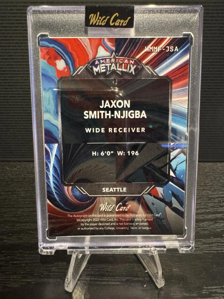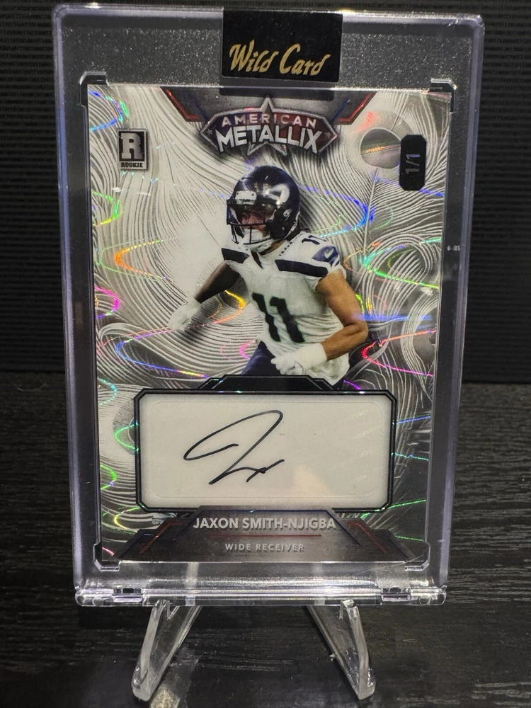 This is a rare 2023 Wild Card American Metallix trading card featuring Jaxon Smith-Njigba of the Seattle Seahawks. The card is autographed by Smith-Njigba, making it a unique 1/1 Rookie Auto card. Manufactured by Wild Card, this sports trading card is part of the 2023 set and is a valuable collectible for fans of football and trading cards.
