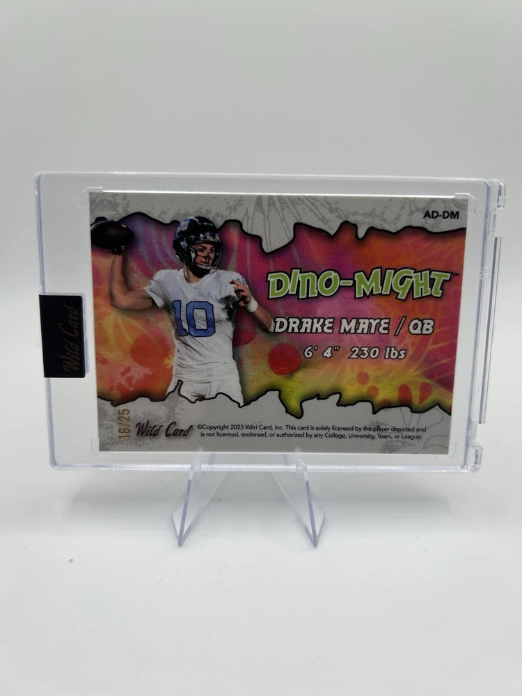 This 2023 Wild Card Dino-Might sports trading card features Drake Maye of the New England Patriots. The card is part of the National Collegiate Athletic Association (NCAA) league and is a near mint or better conditioned, ungraded card. It is a standard size card with a sparkling parallel/variety and is serial numbered as a rookie card. The card is perfect for avid collectors and fans of football and the NCAA. It is a great addition to any collection and is sure to impress with its unique features. Don't miss out on the chance to own this amazing card!