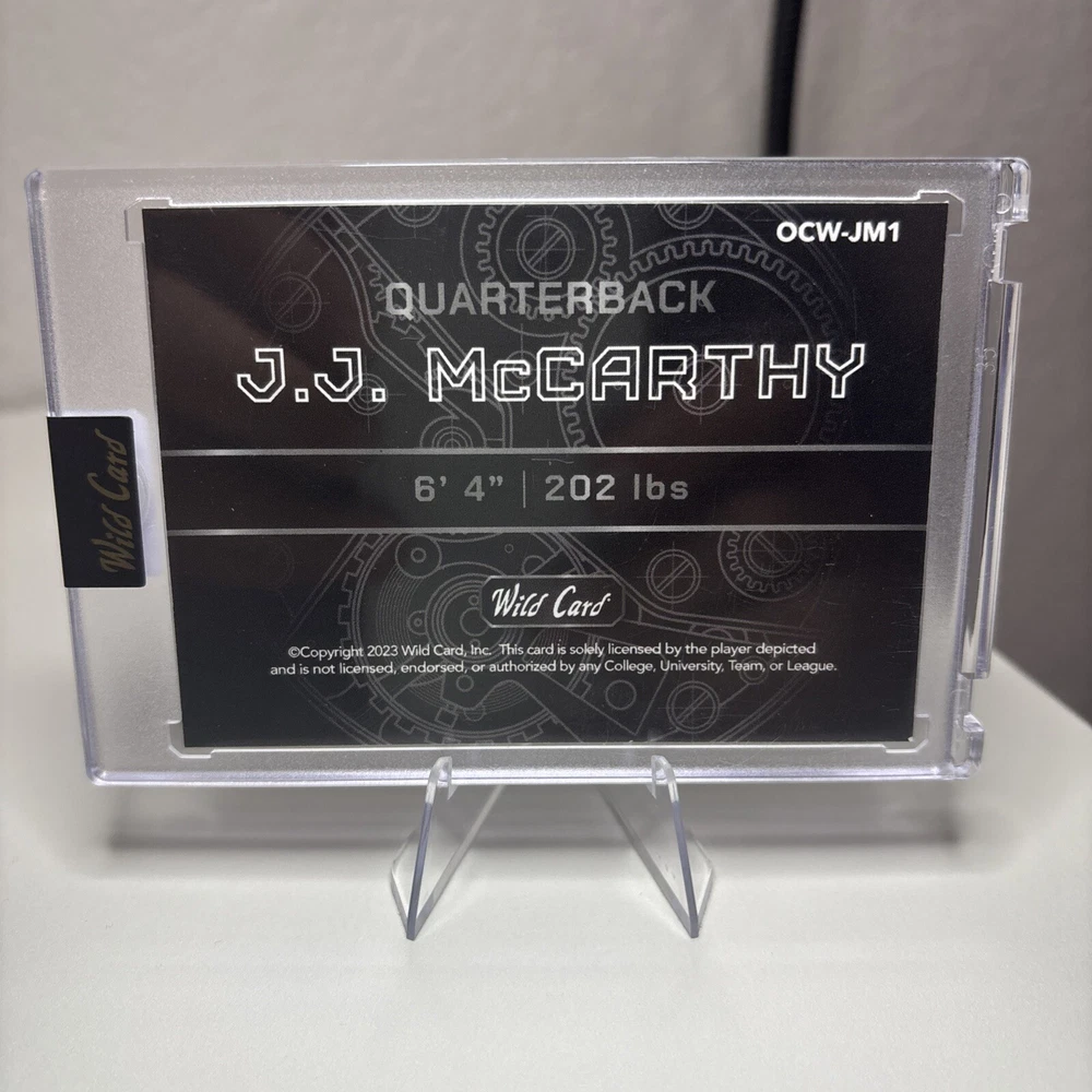 This 2023 Wild Card J.J. McCarthy QB1 On the Clock trading card is a must-have for any football fan or collector. With a rare 1:1 1/1 card number and near mint or better card condition, this card is sure to be a valuable addition to any collection. The card features McCarthy, a talented player/athlete, and is part of the 2023 Wild Card set. Manufactured by Wild Card, this sports trading card is perfect for fans and collectors alike. It falls under the categories of Trading Card Singles, Sports Trading Cards, and Sports Mem, Cards & Fan Shop. Don't miss out on the opportunity to add this amazing card to your collection.