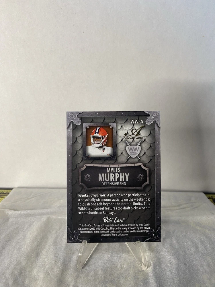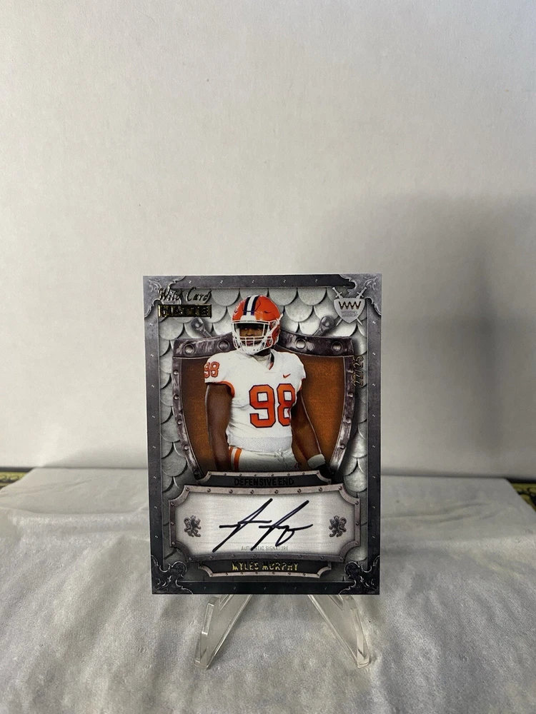 This rare and highly sought-after sports trading card features the autograph of Myles Murphy, a talented player from the Cincinnati Bengals and Clemson Tigers teams. With a print run of only 25, this hard-signed card is a limited edition and comes with a hologram, serial number, and other features that make it an exclusive and valuable addition to any collection. The card is from the Wild Card manufacturer and is part of the 2023 set. It is a parallel variety with a white design and is signed by Murphy himself. This card is a must-have for any football fan or collector looking for a unique and rare item to add to their collection.