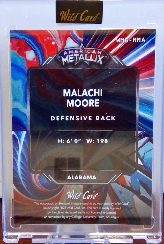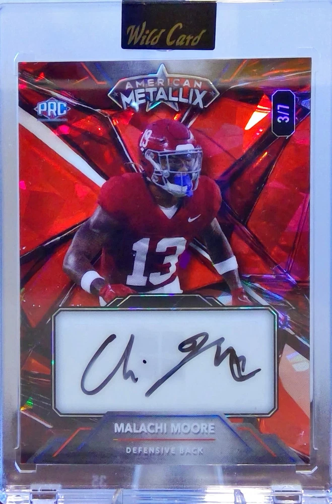 This 2023 Wildcard American Metalix sports trading card features Malachi Moore, a rising star in the football world. With only seven cards in existence, this is a rare find for any collector. The card showcases a stunning design and includes important aspects such as the player's name, season, and type. Perfect for sports enthusiasts and trading card collectors alike, this card is a must-have addition to any collection. Don't miss out on the opportunity to own a piece of history with this 2023 Wildcard American Metalix Malachi Moore card.