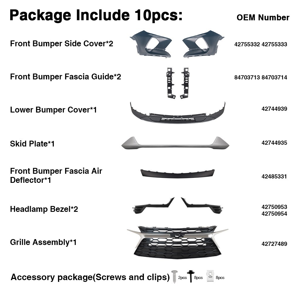 Please note that our products are delivered by folded Specifications Color: As pictures show Placement on Vehicle: Front Type Front Bumper Cover Grille Assembly Kit Complete Condition 100% Brand New Fitment Fit For Chevy Blazer 2023 2024 Package Content 10 Pcs as 1 Set Complete Front Bumper Grille Cover (As picture shows) Front Bumper Side Cover*2 OEM CODE:42755332 42755333 Front Bumper Fascia Guide*2 OEM CODE:84703713 84703714 Lower Bumper Cover*1 OEM CODE:42744939 Skid Plate*1 OEM CODE:42744935 Front Bumper Fascia Air Deflector*1 OEM CODE:42485331 Headlamp Bezel*2 OEM CODE:42750953 42750954 Grille Assembly*1 OEM CODE:42727489 Accessory Package(Screws and Clips) Buyer can paint the bumper cover different color to match the car Feature High Durability Made of ABS material with high durability to extend its long service life and a better shopping experience for you. Attractive Decoration The design of the front bumper cover grille assembly complete is in harmony with your vehicle's exterior and enhances its overall aesthetics. Perfect Fit Manufactured according to originals for a perfect match with your car. Simple Installation Easy installation with direct replacement, other modifications are not required. Stable Performance The front bumper cover grille assembly complete with stable performance provides you a better shopping experience. Note If you have any questions or concerns, please contact us via eBay messages before leaving negative feedback♥ On Apr 10, 2025 at 01:29:51 PDT, seller added the following information: