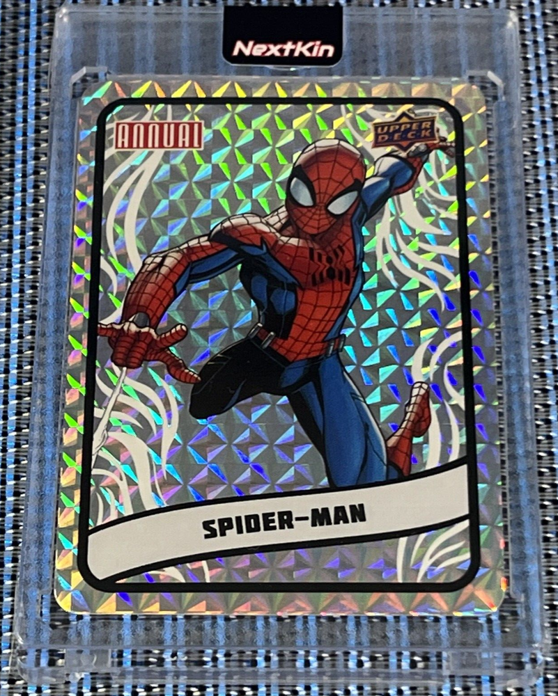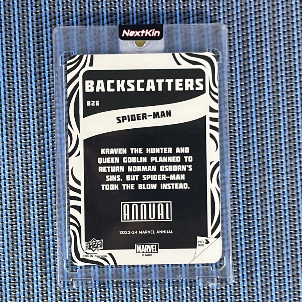 Card Number: Marvel Annual Backscatters Franchise: Marvel (MCU) Parallel/Variety: Marvel Annual Backscatters Type: Non-Sport Trading Card Language: English Set: 2023-24 Marvel Annual Card Size: Standard Vintage: No Country/Region of Manufacture: United States Convention/Event: San Diego Comic Con Material: Card Stock Movie: Spider-Man Original/Licensed Reprint: Original Autographed: No Card Name: NEXTKIN Features: Insert, Sticker Character: Spider-Man Card Thickness: 20 Pt. TV Show: Spider-Man Manufacturer: Upper Deck Genre: Action, Adventure Year Manufactured: 2023