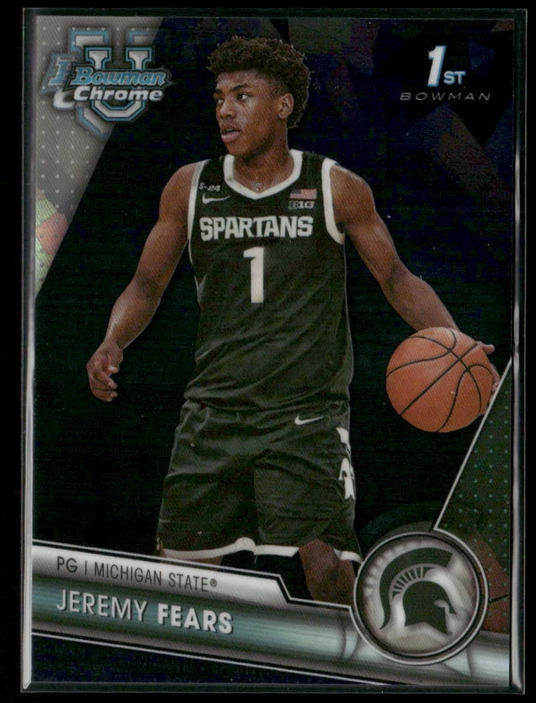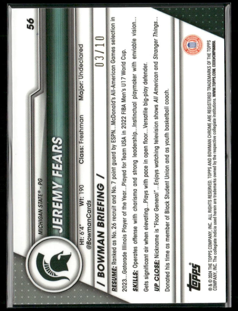 This is a nice example of a 2023-24 Bowman University Chrome #56 Jeremy Fears Black Refractor #/10 Other important information about this card: SN In 2023 Jeremy Fears played for the Michigan State Spartans. Please check out our other listings for more great cards.
