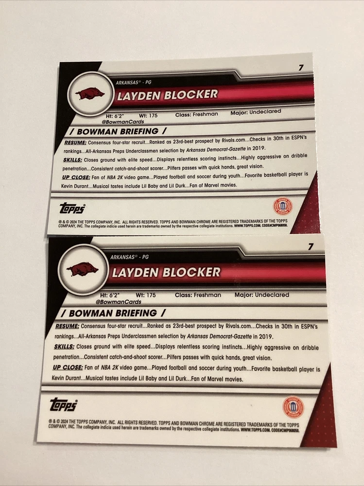 2023-24 Bowman U Layden Blocker RC Bowman Pink Refractor Arkansas Razorbacks💥🔥