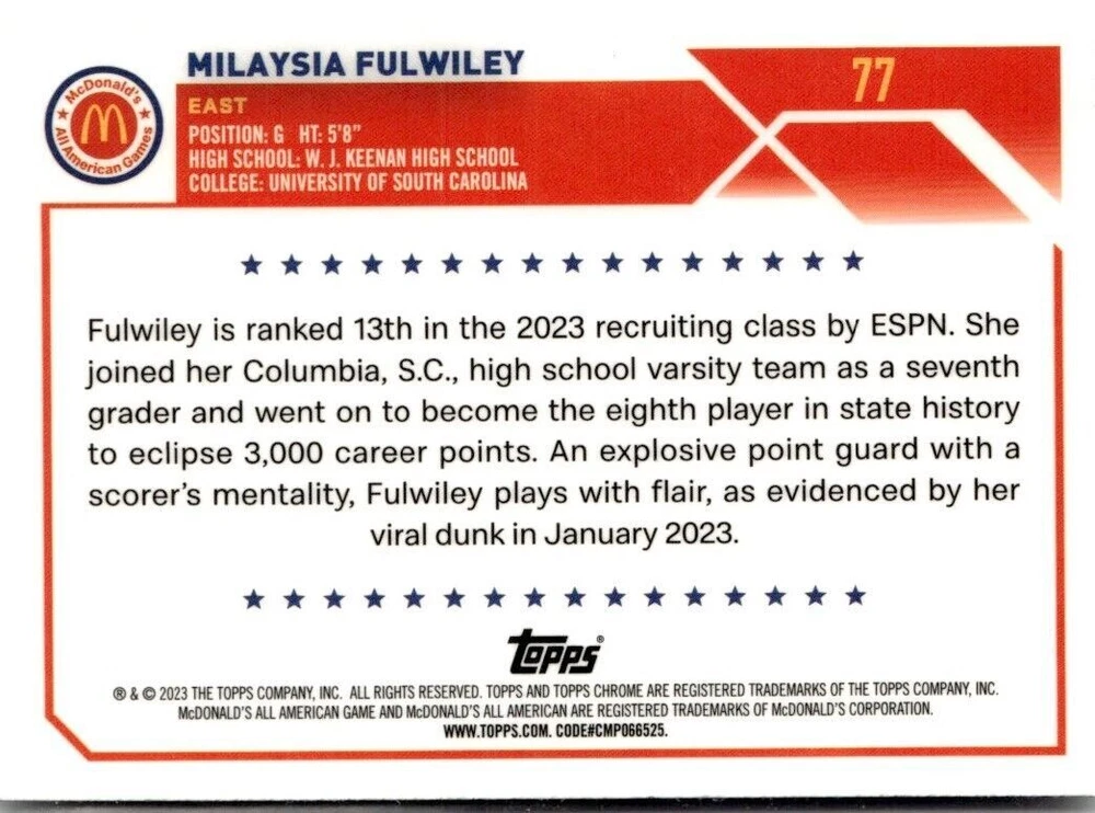 Card Size: 3¾" x 2½" Player/Athlete: Milaysia Fulwiley Autographed: No Set: Topps Chrome McDonald's All American Franchise: Basketball Season: 2023 Graded: No Character: Milaysia Fulwiley Card Name: 2023-24 CHROME MCDONALD'S ALL AMERICAN MILAYSIA FULWILEY UNIVERSI Year Manufactured: 2023 Team: University of South Carolina Original/Licensed Reprint: Original Card Number: 77 Sport: Basketball Type: Sports Trading Card Vintage: No Manufacturer: Topps Game: Unspecified
