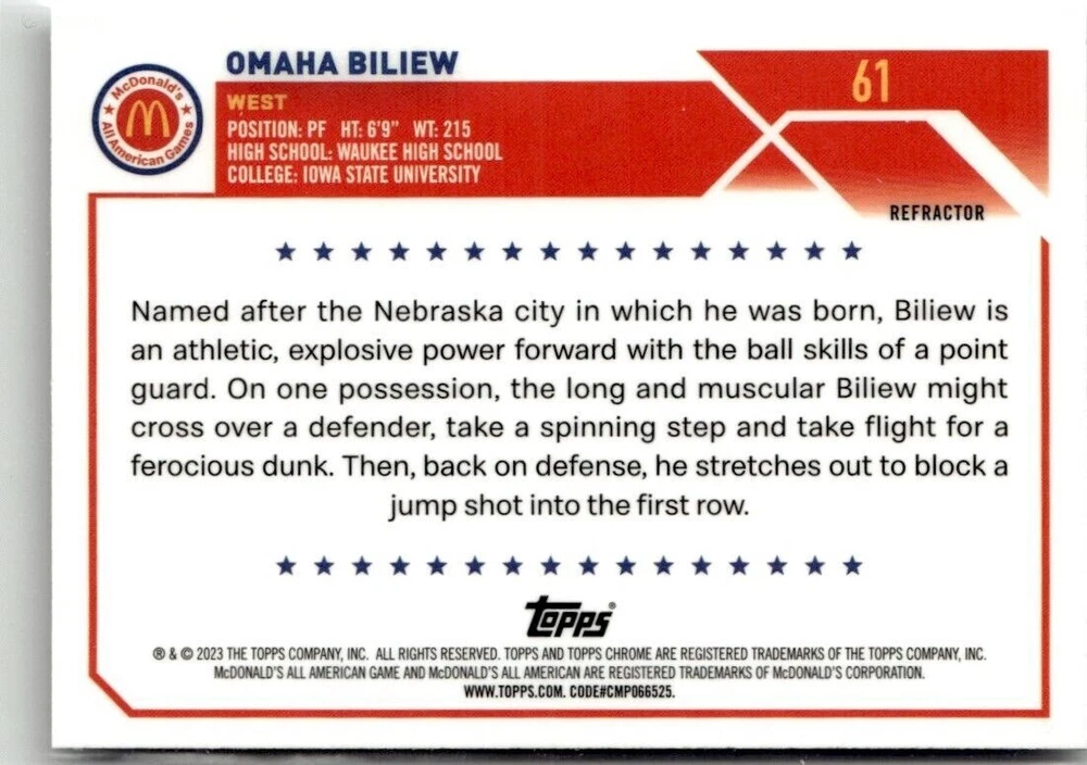 Game: Unspecified Year Manufactured: 2023 Team: Iowa State University Card Size: 3½" x 2½" Sport: Basketball Manufacturer: Topps Card Number: 61 Franchise: Basketball Character: Omaha Biliew Player/Athlete: Omaha Biliew Autographed: No Original/Licensed Reprint: Original Type: Sports Trading Card Season: 2023 Vintage: No Graded: No Set: Topps Chrome McDonald's All American Card Name: 2023-24 CHROME MCDONALD'S ALL AMERICAN OMAHA BILIEW IOWA STATE UN