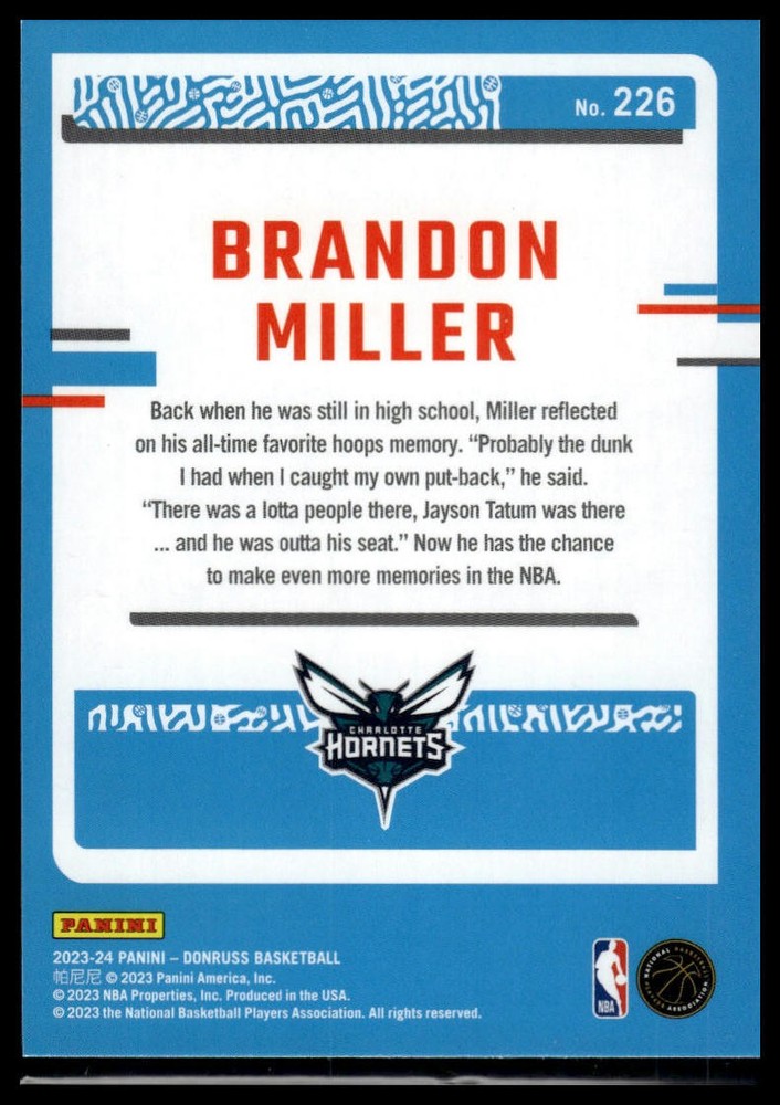 This is a nice example of a 2023-24 Donruss #226 Brandon Miller Other important information about this card: Rated Rookie RC,Chase,Checklist,Parallel,Insert,Exclusive In 2023 Brandon Miller played for the Charlotte Hornets. Please check out our other listings for more great cards.