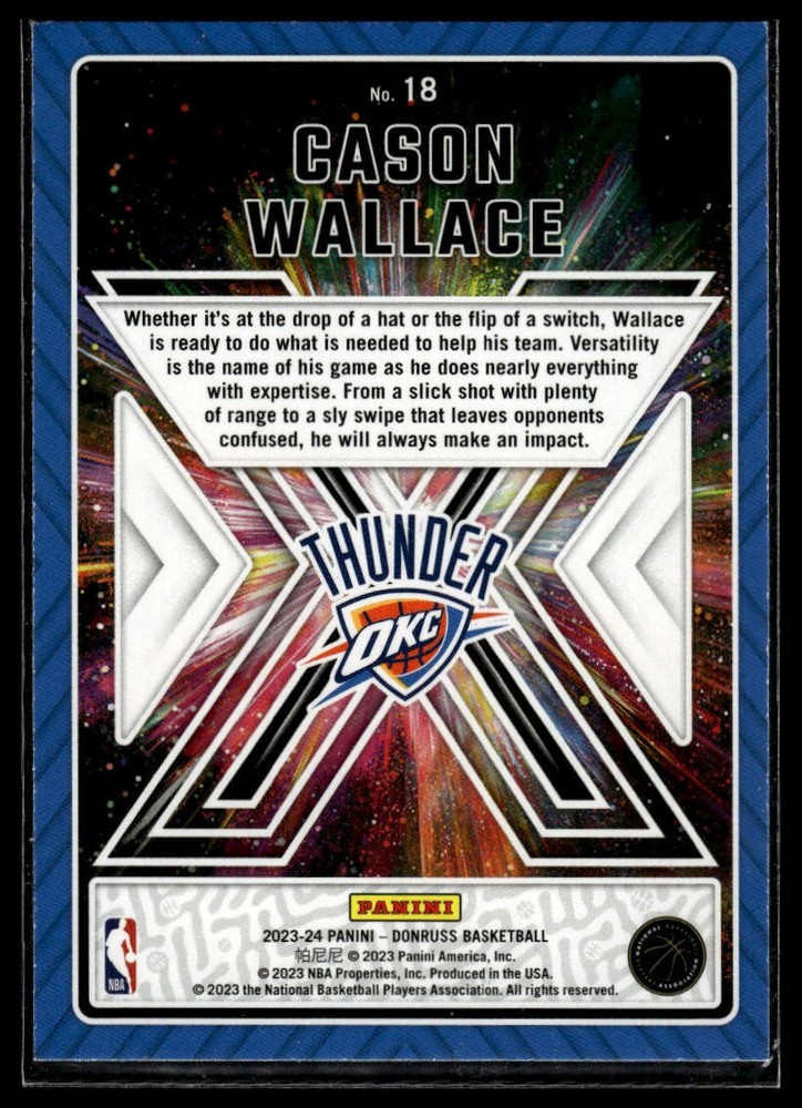 This is a nice example of a 2023-24 Donruss #18 Cason Wallace Great X-Pectations Other important information about this card: Rookie Chase,Checklist,Parallel,Insert,RC,SP In Cason Wallace played for the Oklahoma City Thunder. Please check out our other listings for more great cards.