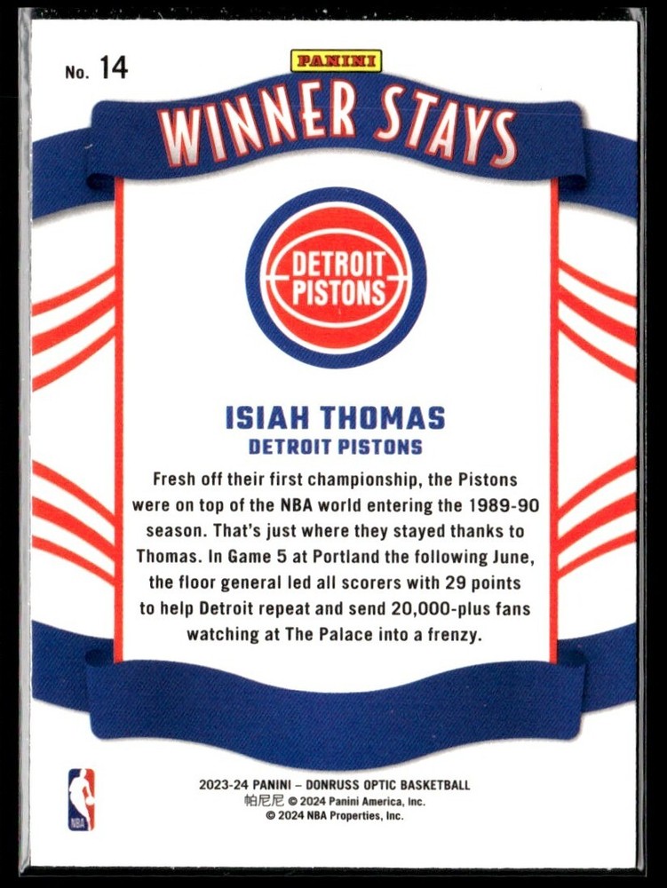 About Me Other Listings Feedback Add to Favorites Contact Me eBay Store DJ Chino Sports 2023-24 Donruss Optic Winner Stays Base Isiah Thomas Detroit Pistons #14 No stock photo / These are real scans or pictures Details Description: Isiah Thomas Category: Basketball Year: 2023 Product: Donruss Optic Winner Stays Set: Base Team: Detroit Pistons Card Number: 14 Dimensions: 3½" x 2½" SKU: BK A0001 R02 Q (109) Payment Payment due upon purchase. Shipping Shipping - Please see shipping for pricing and details. - Every card (excluding graded cards) will be shipped in a penny sleeve and Card Saver. Some cases in a top loader. - Any damage to your card during shipping, or not received. I will contact eBay to issue a refund. - I honor combined shipping and discounted shipping for additional items. For standard cards, $.10 each for additional cards. For more information, please check shipping details. - For Graded Cards, I will be shipping in a standard box and well protected. Returns and Claims No returns or cancellations accepted. About Us Welcome to my store. I have been collecting cards for 30+ years and enjoy collecting. I am starting my store so that I can share my collection to the world. Please check out my other listings and feel free to reach out to me with any questions. Thank you. Cards Information - Cards are scanned and immediately after break. - Please refer to photos for additional details. - Cards are in NMINT or better shape may have lines, smudges, different color, or dust due to the scanner. If you would like more details on this card. Please message me and will be happy to send other photos. - Cards may have minor flaws such as slight corner/edge dings, production printing, surface dimples, ect. Please message me if you have questions. - All my cards are stored in a cool environment and in card boxes. - With listings that have multiple quantities. I do label condition, and may not be the card you you see in the picture. If you would like additional photos, please let me know and will eBay message you photos. Listing By Kronocard trading cards software v2.8.1.2