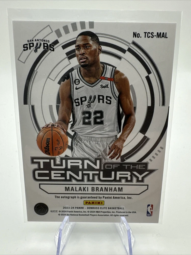 This 2023-24 Donruss Elite sports trading card features Malaki Branham of the San Antonio Spurs. The card is autographed and part of the Turn of the Century Signatures insert set, with a card number of TCS-MAL. It is a limited edition, exclusive card with a hologram, short print, parallel/variety, and checklist features. The card is perfect for collectors and fans of basketball trading cards. The card comes in a box topper, insert, and chase variety, making it a must-have for any sports memorabilia collection. Get your hands on this elite card from the renowned manufacturer Panini and add it to your collection today!
