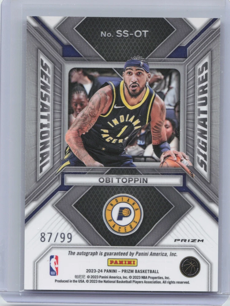 Year Manufactured:2023Season:2023-24Manufacturer:PaniniParallel/Variety:SignaturesSport:BasketballPlayer/Athlete:Obi ToppinLeague:National Basketball Association (NBA)Team:Indiana Pacers