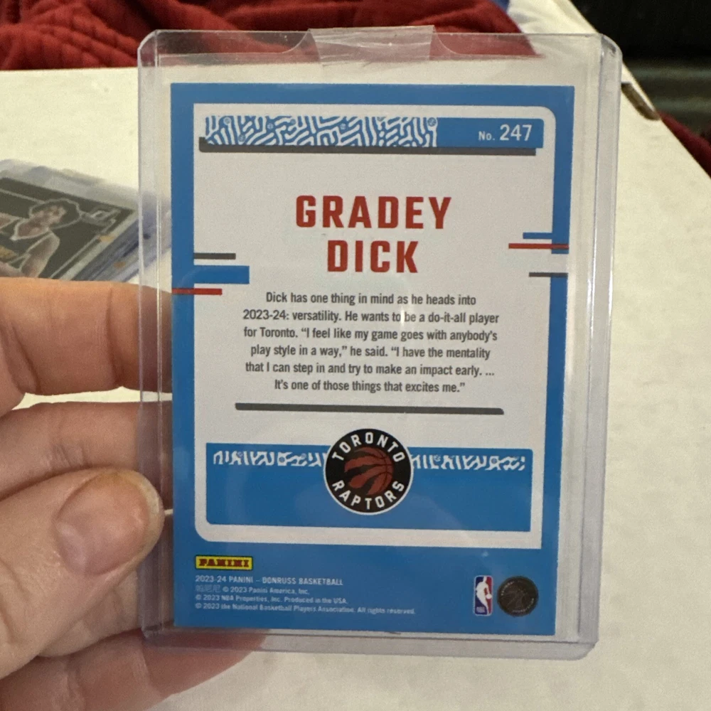 This 2023-24 Panini Donruss Choice Gradey Dick Silver MOJO Rated Rookie RC trading card is a must-have for any basketball fan. Featuring the highly sought-after Silver Mojo parallel/variety, this exclusive short print card is authenticated by Donruss and showcases the up-and-coming rookie, Gradey Dick. With a hologram and the iconic Panini logo, this card is a true collector's item. It's perfect for adding to your collection or as a gift for a fellow basketball enthusiast. The card is from the 2023-24 season and features Gradey Dick in his Charlotte Hornets, Cleveland Cavaliers, Toronto Raptors, Milwaukee Bucks, and Denver Nuggets jerseys.