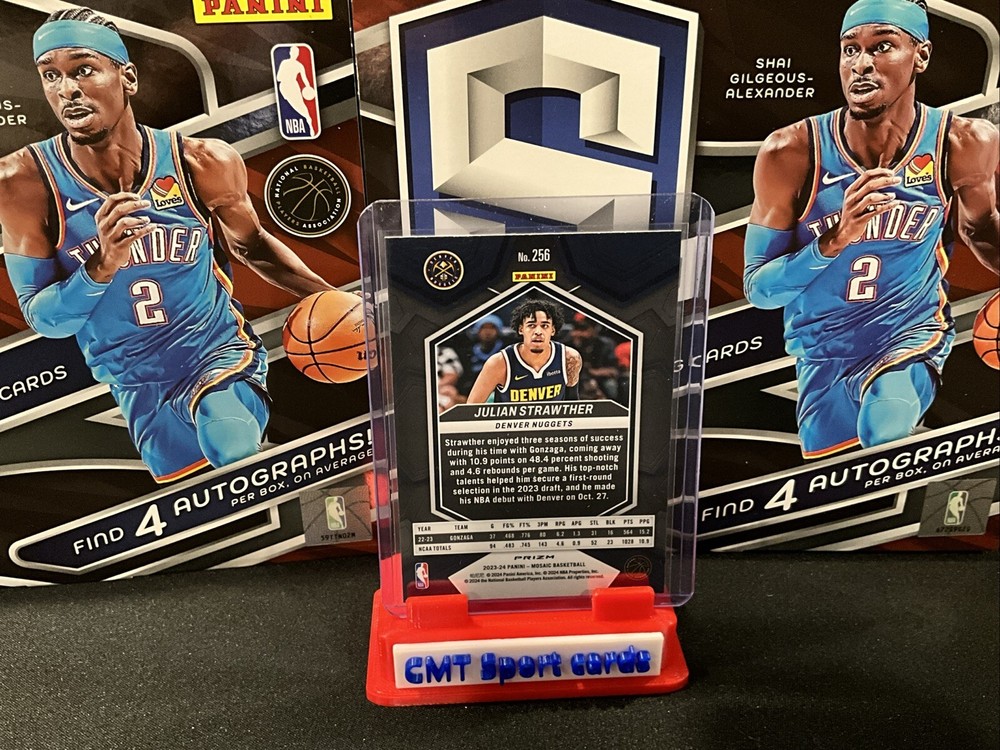 This amazing sports trading card is a must-have for any basketball fan! Featuring Julian Strawther, a rookie player from the National Basketball Association (NBA), this 2023 Panini Mosaic card is a true gem. The card is part of the NBA Debut Prizm set and boasts a stunning design that will blow you away. With its beautiful parallel variety and unique features, this card is a great addition to any collection. Whether you're a seasoned collector or just starting out, this sports trading card is a perfect choice for anyone who loves basketball. So don't miss out on this opportunity to own a piece of sports history!