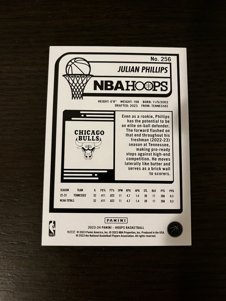 Elevate your basketball card collection with the 2023-24 Panini NBA Hoops Rookies Silver /199 Julian Phillips #256 Rookie RC. This exclusive card highlights Julian Phillips, a promising talent for the Chicago Bulls, captured in the iconic Panini NBA Hoops set. The card boasts a sleek silver parallel variety, adding a touch of elegance and rarity to your assortment. With a limited print run of just 199, owning this card means holding a piece of basketball history. The card is meticulously crafted by Panini America, Inc., ensuring the highest quality for collectors and fans of the sport. Whether you're a dedicated follower of Phillips's career or a connoisseur of NBA memorabilia, this rookie card is a noteworthy addition to any collection.