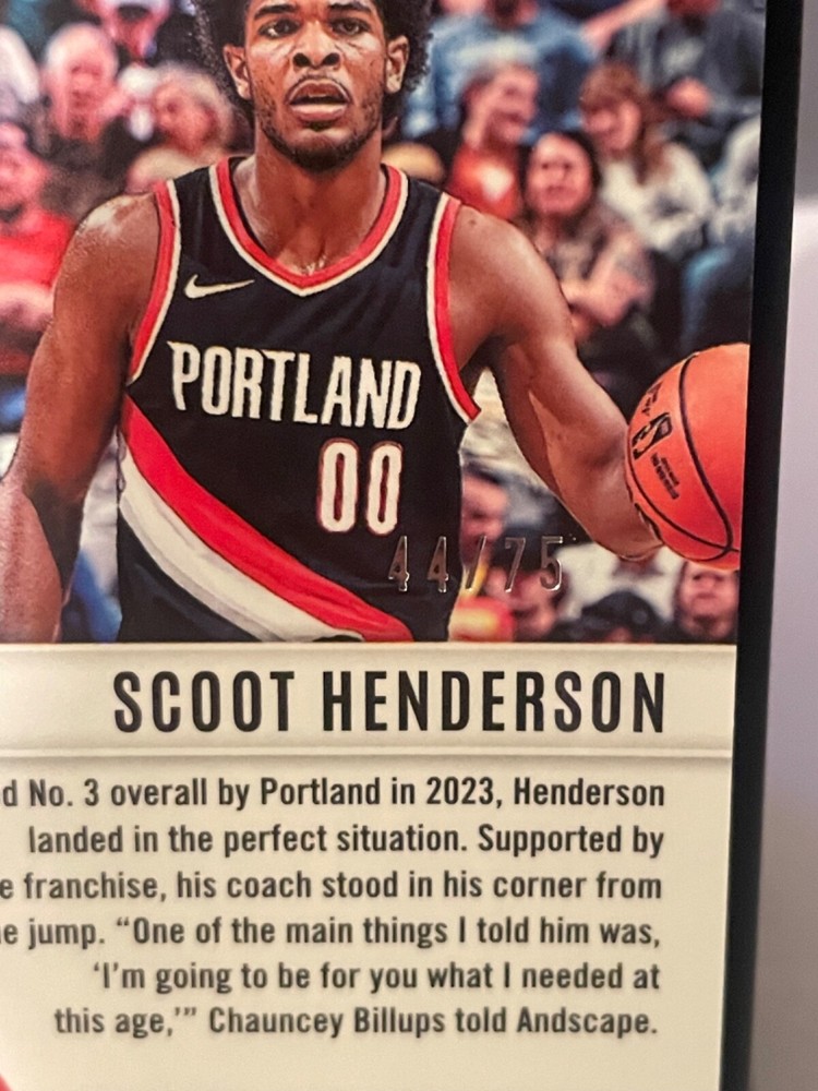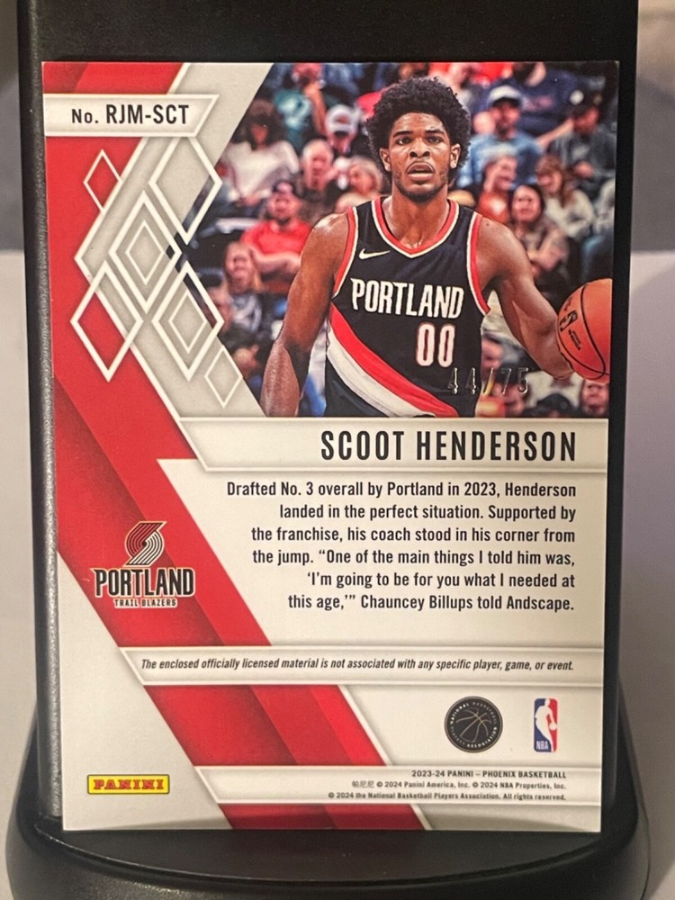 2023-24 Panini Phoenix Scoot Henderson Orange Rookie Jumbo Patch 44/75 RJM-SCT This rare 2023-24 Panini Phoenix Scoot Henderson Rookie Jumbo Memorabilia card is a must-have for any serious basketball card collector. With a print run of only 75, this card is one of the most sought-after cards on the market. Featuring an orange parallel/variety, serial numbering, and color match of the on card jersey & patch, this card is truly a gem. The card is made of high-quality card stock with a thickness of 100 Pt. and includes a memorabilia patch of Scoot Henderson, a rising star in the National Basketball Association (NBA). As a part of the Rookie Jumbo Memorabilia insert set, this card is a perfect addition to any collection. Don't miss out on the chance to own this rare and valuable card **Please note, if I accept your best offer or you accept mine, payment is expected within 48hours of acceptance or the auction is cancelled at buyer’s request. I understand eBay gives longer for payment but I do not and it is clearly described here so please do not purchase if you cannot abide by this.