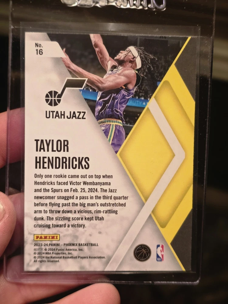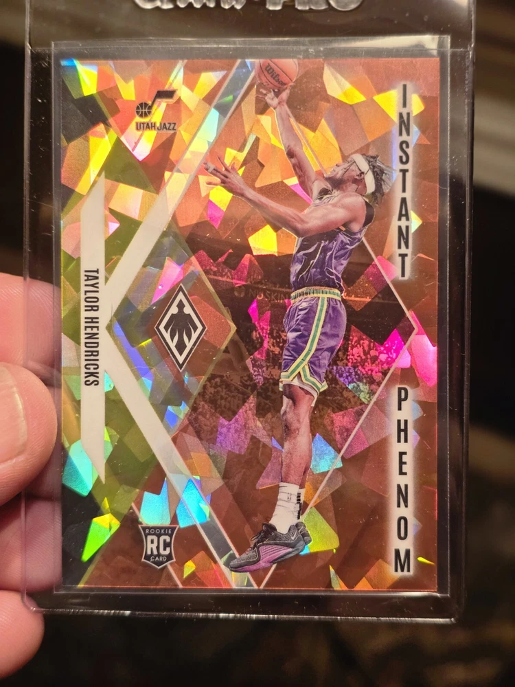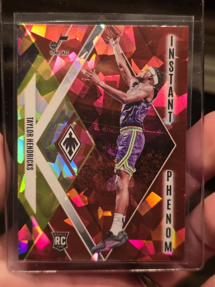 Beautiful rookie lot for Taylor Hendricks ORANGE CRACKED ICE /249 RED ICE PARALLEL 2023-24 Panini Phoenix Basketball trading card features Taylor Hendricks of the Utah Jazz. The card is part of the "Instant Phenom" set and is numbered 2 out of 249. It is a rookie card and also includes serial numbering and parallel and insert features. The card is perfect for any basketball fan or collector and is a great addition to any sports trading card collection. It is manufactured by Panini and is part of the National Basketball Association (NBA) league. Get your hands on this limited edition card today!