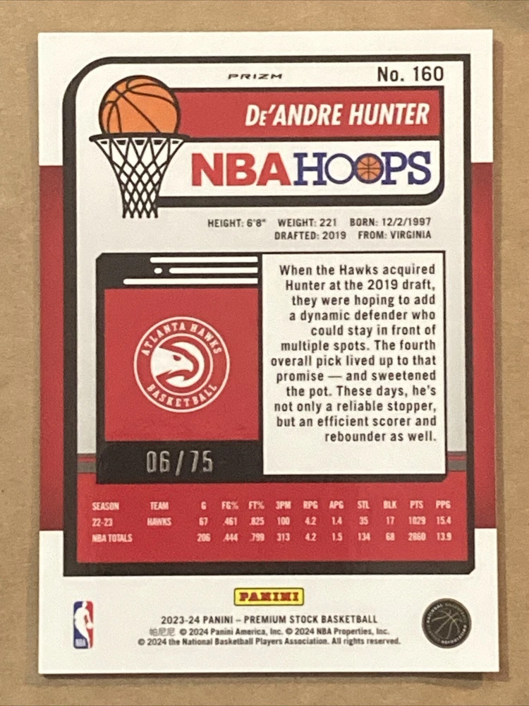 Elevate your basketball card collection with the 2023-24 Panini Premium Stock De'Andre Hunter Blue Pulsar card. Serial numbered to just 75, this limited-edition piece is a must-have for fans and collectors alike. Featuring the Atlanta Hawks' standout, De'Andre Hunter, this card captures the essence of the player's potential and is a great way to show your support for the team. The Blue Pulsar parallel adds an extra layer of rarity and appeal to this already valuable card. As part of the esteemed 2023-24 Panini set, it's a contemporary collectible that celebrates the National Basketball Association's talent. Whether for display or as a cornerstone of your collection, this card delivers both visual appeal and the excitement of the sport.
