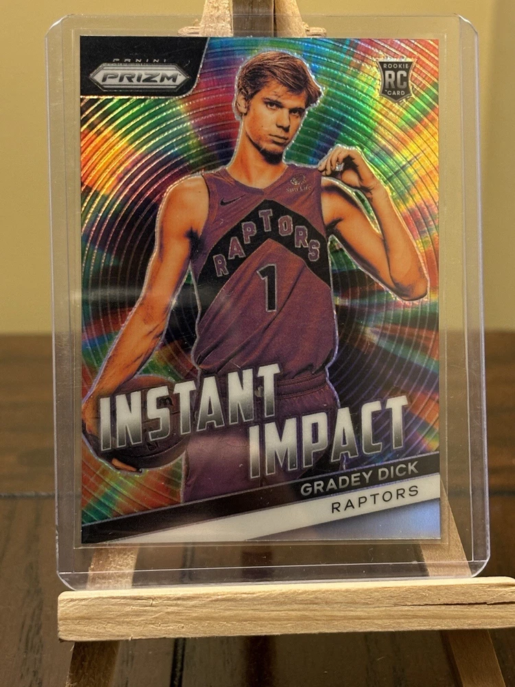 Up for sale is a 2023-24 Panini Prizm #20 Gradey Dick Instant Impact RC Raptors trading card. This card features the rising star of the Raptors basketball team and is a great addition to any sports trading card collection. It was manufactured in 2024 by Panini and is part of the Instant Impact RC insert set. This trading card is perfect for fans of the NBA, and specifically the Raptors team. It is ungraded and autographed. The card number is 20 and it also features the following aspects: League (NBA), Set (2023-24 Panini Prizm), Player/Athlete (Gradey Dick), Year Manufactured (2024), Sport (Basketball), Type (Sports Trading Card), Parallel/Variety (Instant Impact RC), Manufacturer (Panini), Features (RC), and Season (2024). Don't miss out on the chance to add this rare and valuable card to your collection.