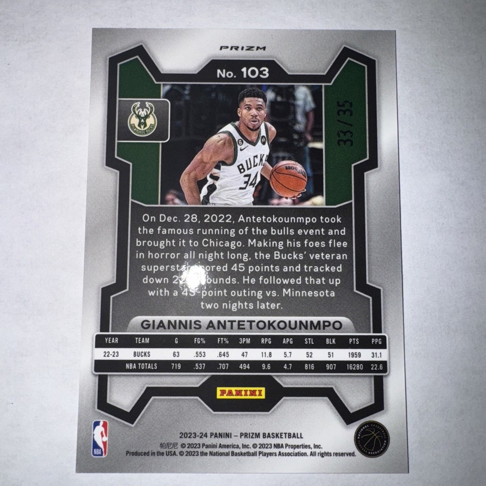 This Giannis White Ice Prizm is a must-have for collectors! The /35 rarity makes it a standout, and the crisp design pops with vibrant colors. A stunning addition to any NBA card collection—highly recommended for serious fans and investors alike.